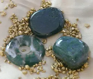 Es sei erwähnt, dass der Moosachat seinen Namen eigentlich zu Unrecht trägt, denn mit „Moos" hat er rein gar nichts zu tun: Bei den überwiegend grünlichen Einschließungen, die maßgebend die Farbe beeinflussen, handelt es sich vornehmlich um Verunreinigungen, die durch die recht poröse Oberfläche des Steins eindringen und sich in ihm verankern. Dadurch entstehen vielfältige Farbvarietäten: Moosachate gibt es in hellem Grau, graublau, bläulich oder farblos, rötlich-orange, milchig weiß, jeweils mit moosgrünen Einschlüssen.