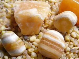 Die Steine wurden auf einer Myrrhe-Räucherung fotografiert. Das gelb-braune, getrocknete Harzgranulat findet seit Jahrtausenden als Reinigungsräucherung Anwendung. Sein Geruch ist leicht herb und verstrahlt eine erdige Atmosphäre. Myrrhe wird astrologisch der Sonne zugeordnet.